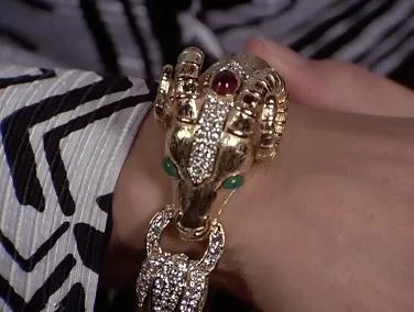 Leslie has totally gone into mini-Alexis mode even imitating her in her own office. Of course, Alexis catches this little act and tells Leslie that imitation is not flattery and that she needs to discover her own persona. Alexis is actually mentoring Leslie - who would have thunk it. The sisters are doing it for themselves. To give Leslie the taste of her future, Alexis gives her this hideous bracelet that Leslie has been wearing a copy of. Wow, that thing cost $24,000, and Leslie copied it. Maybe style was pretty bad in the late 1980s. Okay, enough of the bracelet.
